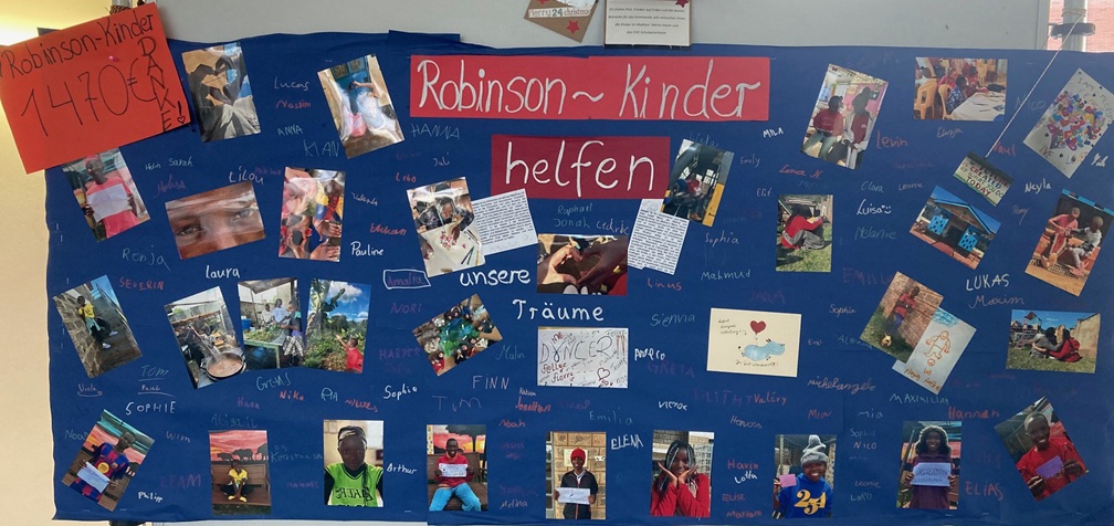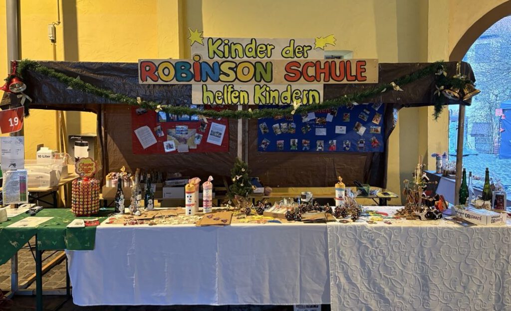 Auch in diesem Jahr war die Robinson-Schule wieder mit einem Stand auf dem Hattersheimer Weihnachtsmarkt vertreten. Hier verkauften die Kinder selbstgebastelte weihnachtliche Geschenke, um Spendengelder für die beiden Patenkinder Hellen und King’Ori in Kenia zu sammeln. Dieses Jahr kamen stolze 1470,80 Euro zusammen!